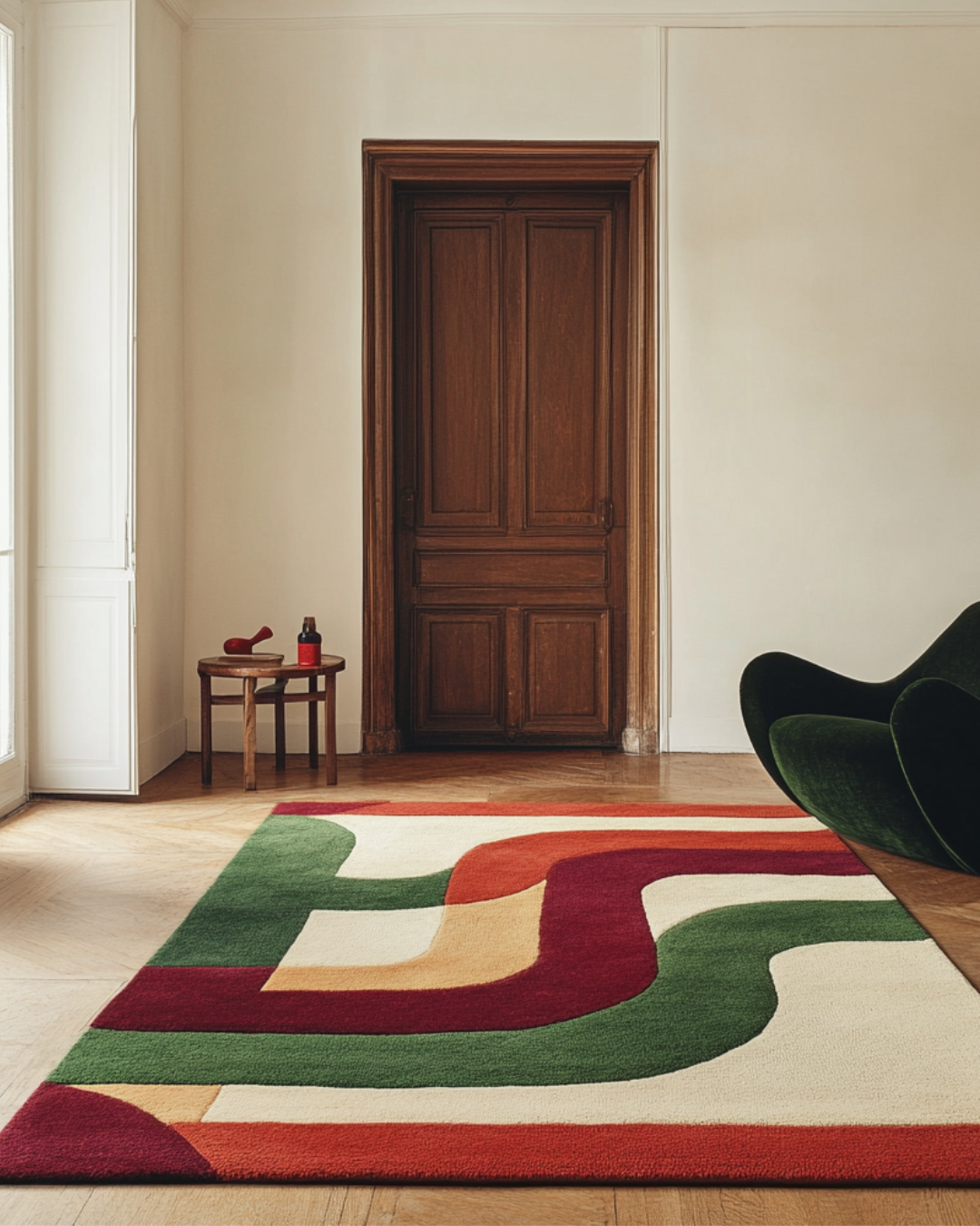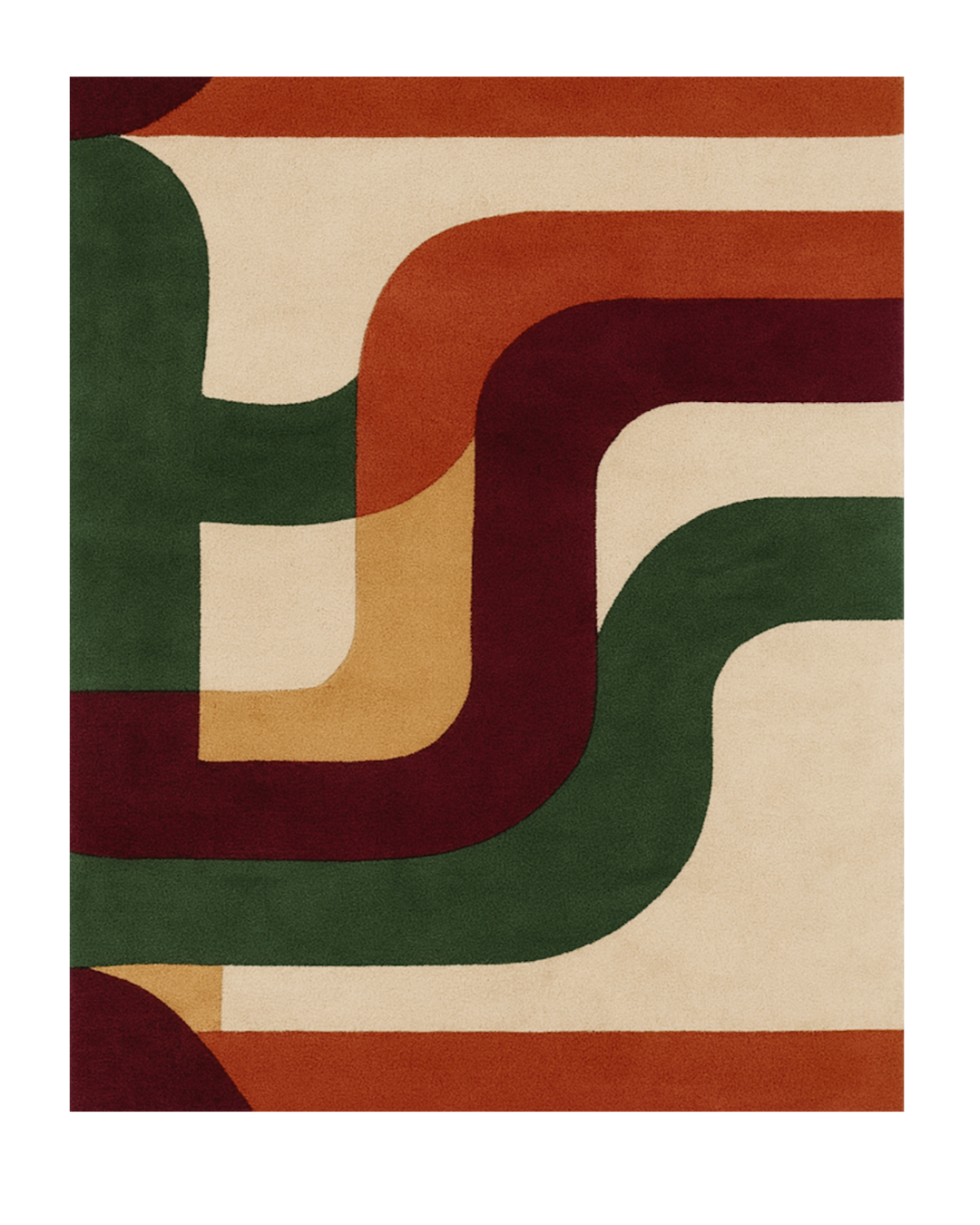 Ce tapis, appelé Groove, est réalisé en laine. Il présente un motif géométrique fluide aux formes ondulées et aux couleurs riches — vert, rouge bordeaux, orange et crème — qui se mêlent harmonieusement pour créer un effet à la fois rétro et contemporain. Sa texture en laine apporte chaleur et confort, tandis que son design audacieux dynamise l’espace tout en restant élégant.